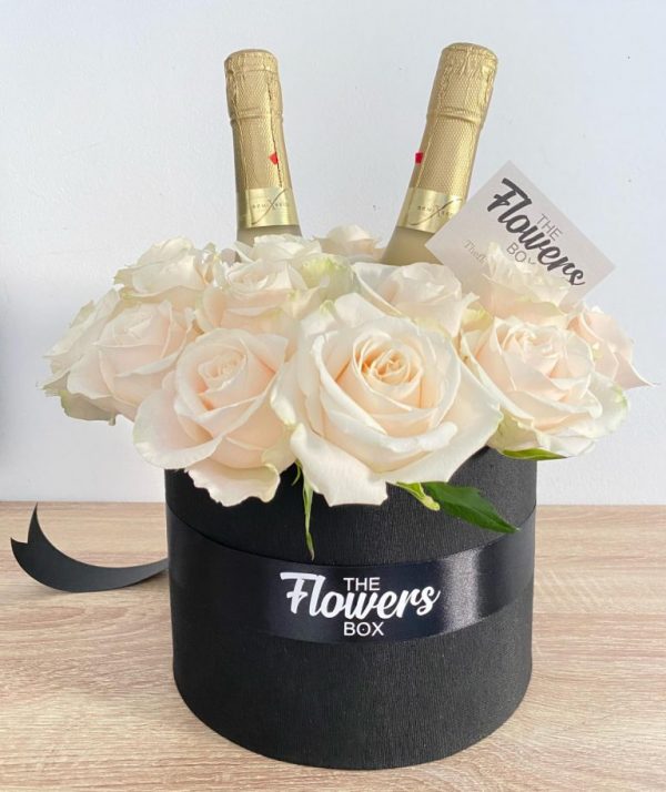 Flower Box negra con rosas en tono Champán y dos botellines de cava.