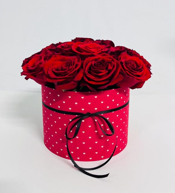 Este elegante arreglo floral cuenta con 25 rosas rojas presentadas en una caja de tela decorada con corazones blancos. Perfecto para expresar amor y afecto en ocasiones especiales.
